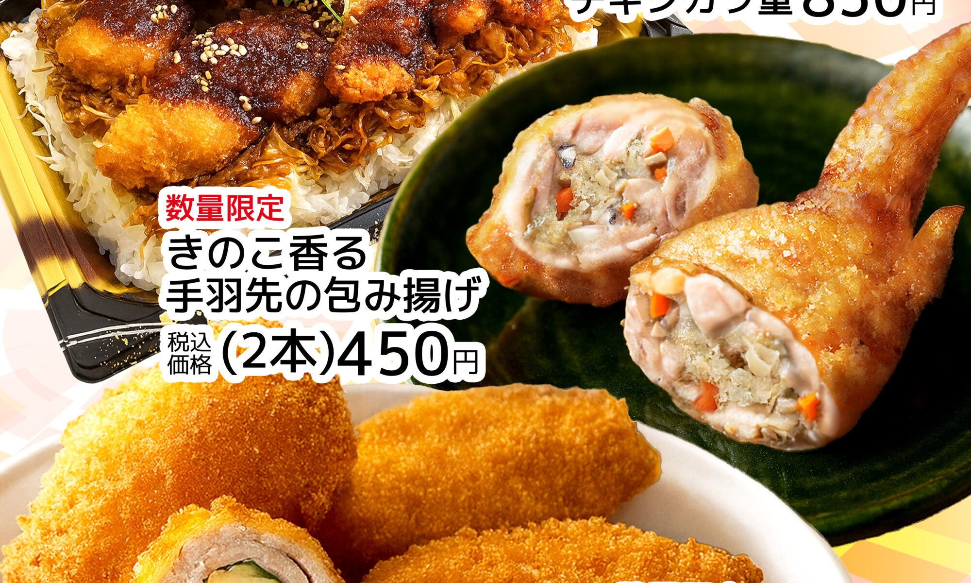きのこ香る手羽先の包み揚げ・きのこの旨みと香りがふわっと広がる手羽先の包み揚げ。おつまみにもごはんのおかずにもピッタリです!!